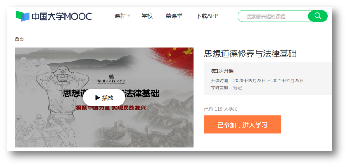 为认真落实学校《关于实施打造“思政金课”专项行动计划方案》,着力推进学校思政课改革创新,由我校马克思主义学院查广云教授、陈姝娅博士领衔,郁云琦、熊峰、崔建伟、王飞副教授以及来自浙江金融职院、浙江商业职院、金华职院、浙江经济职院等全省6所“双高计划”高职院校共计22位优秀思政课教师联袂主讲的“思想道德修养与法律基础”在线开放课程正式在中国慕课网(MOOC)开课。