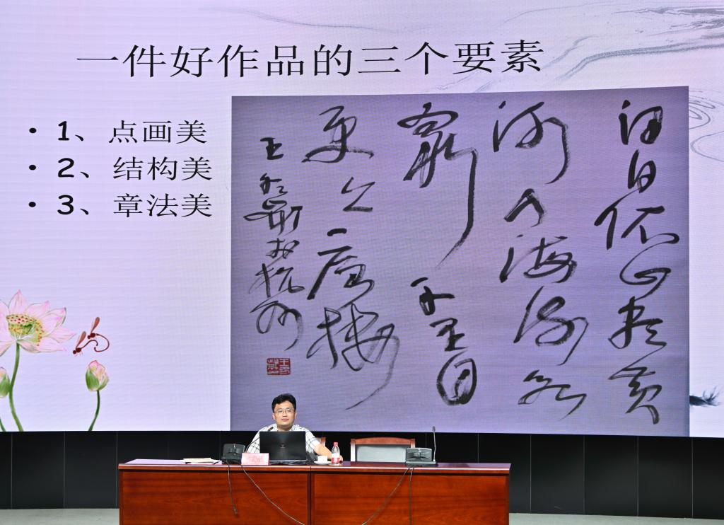 而后,高老师用从古至今的不同字体和其代表作品,来细细教我们如何欣赏书法中的美。从行笔中“点如高山坠石,横如千里阵云”的点画美,到整字而言的端正平稳,均衡对称的结构美,还有从整个作品入眼的章法美。带领我们从篆刻在龟甲兽骨上领略了书法这一艺术的起源,从李斯的《峄山碑》看书法的整齐圆匀;从《曹全碑》里读汉隶的庄重典雅;在“颜筋柳骨”里品读楷书的中正规整,棱角分明,还有王羲之、唐寅等行书的行云流水,舒展有型,更在“颠张醉素”笔下体会了草书的狂放不羁,飞扬飘逸。