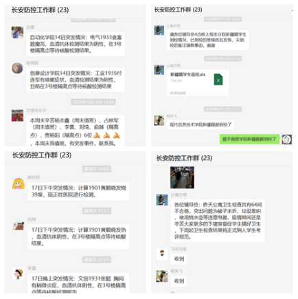 全面摸排学生信息,精准掌握学生动态。辅导员始终坚守在学生工作疫情防控第一线,“点对点”给予支持帮助。实现测温、上报、检测、隔离的闭环管理。17天来,对40余名全国重点地区返校学生严格落实“一对一”责任制,护送学生就医50余次。在这场复学大考中,铃声就是号角,防控就是使命。长安校区辅导员全天待命、日夜坚守,确保抗议防线不失守。