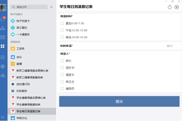 学生返校后,按规定每日需进行晨、午、晚三次体温测量与上报。为满足信息全覆盖、数据精准化、异常报警时效高等管控需求,信息管理中心再次迎难而上,加班加点研发出疫情防控测温报送信息平台,学生可自主在企业微信上填报测温情况,并与进校进宿码绑定,体温不填报则无法申请进宿进校,以此督促学生自觉进行体温报备。各分院可在“最多跑一次”系统上一键导出本分院学生的体温数据,以时刻关注学生的健康情况。