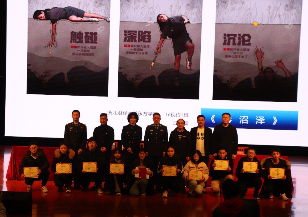 为积极配合海宁市禁毒办禁毒宣传工作,进一步加强校园禁毒宣传教育力度,提高师生识毒、拒毒、防毒、禁毒意识和能力,12月18日,海宁市首届“青春无毒”大学生禁毒作品创作大赛颁奖典礼在长安校区举行,来自海宁高校的近600名师生参加。本次大赛由海宁市禁毒委主办,我院和浙江财经大学东方学院等协办。本次大赛自启动以来,经过作品征集,共收到101件参赛作品,经过评选,其中19件作品脱颖而出。我院在本次大赛中获得优异的成绩,共有8名同学获奖,其中荣获二等奖1名、三等奖2名、优胜奖5名。