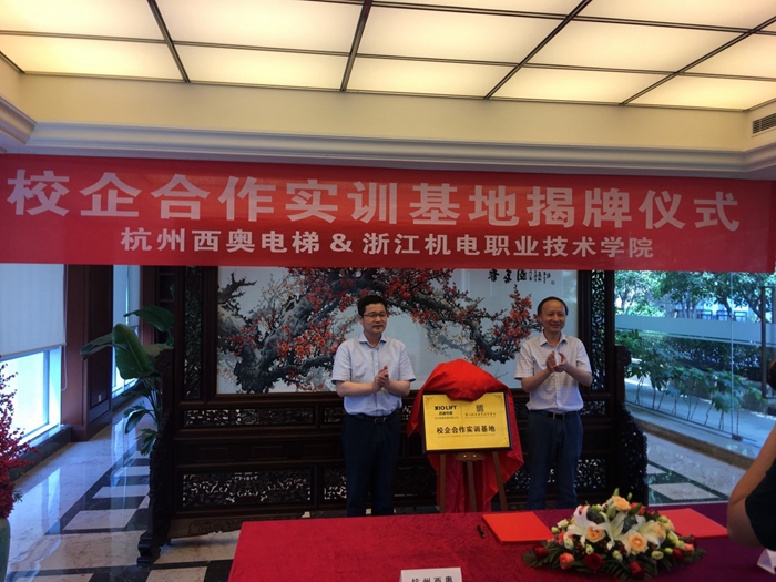 在大家的见证下杭州西奥电梯有限公司常务副总裁王国卿和我院党委委员丁明军进行了校企合作签约和授牌。