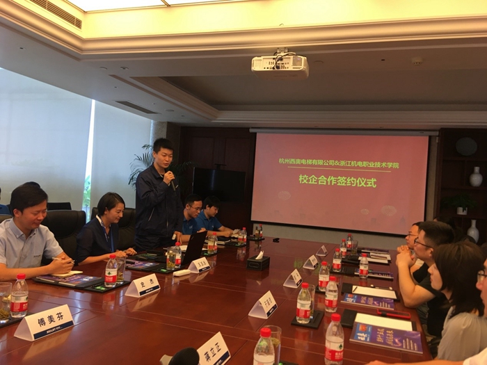 经过和杭州西奥电梯有限公司一年多的校企合作磨合,在西奥电梯五楼会议室进行了校企合作签约/揭牌仪式。西奥电梯人才发展经理王玉云对我院“西奥现代学徒制班”人才培养方案进行了介绍,从历年合作项目、文化传承、班组管理,晋升途径、员工关怀等几个方面详细的阐述了西奥电梯对人才培养的全过程,并播放了我院学生实习、军训视频,展现了我院学子吃苦耐劳,勇于拼搏的风采。我院“西奥现代学徒制班”学生(学徒)代表从在西奥的培训学习、工作、生活等三个方面向学校老师进行了汇报,并感谢学院老师来企业看望和实习走访指导。