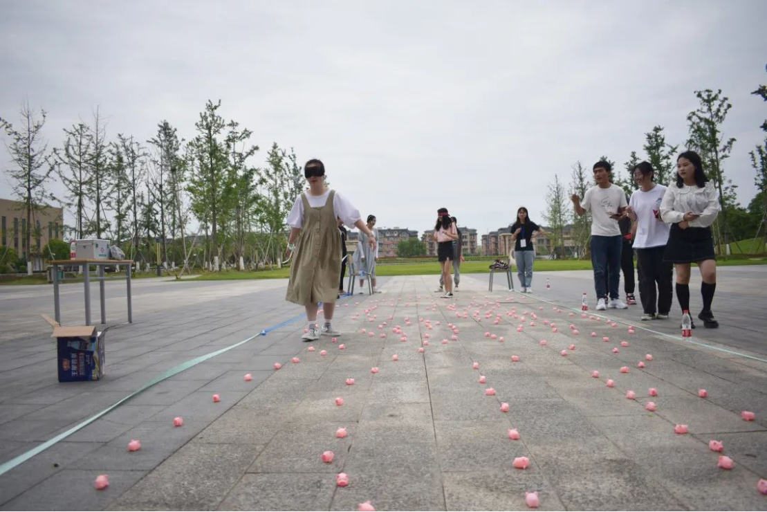 第三个关卡:“会宁”——革命根据地。每个参赛小组选择一名队员蒙上眼睛,通过现场队友指挥来到达终点。此关卡活动使同学们更加明白团队合作的重要性,让同学们了解到党在革命根据地建设中的重重阻碍,以及凝聚力量的重要意义。