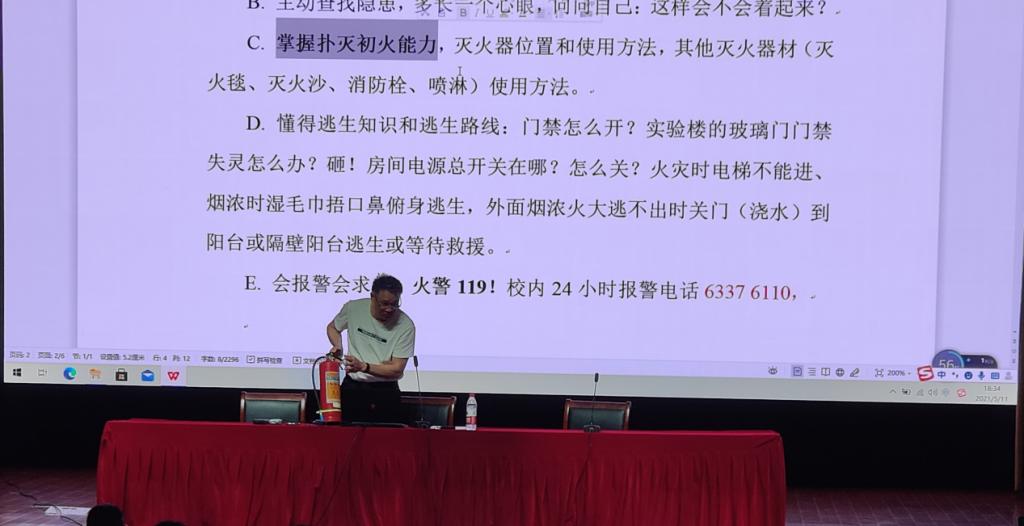 本次讲座,苗处长向同学们讲解了消防安全(重中之重)、财务安全、交通安全、饮食安全、政治安全、实验室安全等八个方面的安全。讲解消防安全时,苗处长利用现场的灭火器向同学们详细讲述并演示使用方式,以及使用时需要注意的问题。同时,他还向同学们介绍了各类诈骗案件,并且提醒同学们一定要切记:天上不会掉馅饼,不要有贪财心理,个人信息及隐私严格保密,转账支付一定要核实,特别是QQ朋友微信朋友来借钱,电话核实必须要有,各种链接别去点,这些链接往往是不安全的网站。