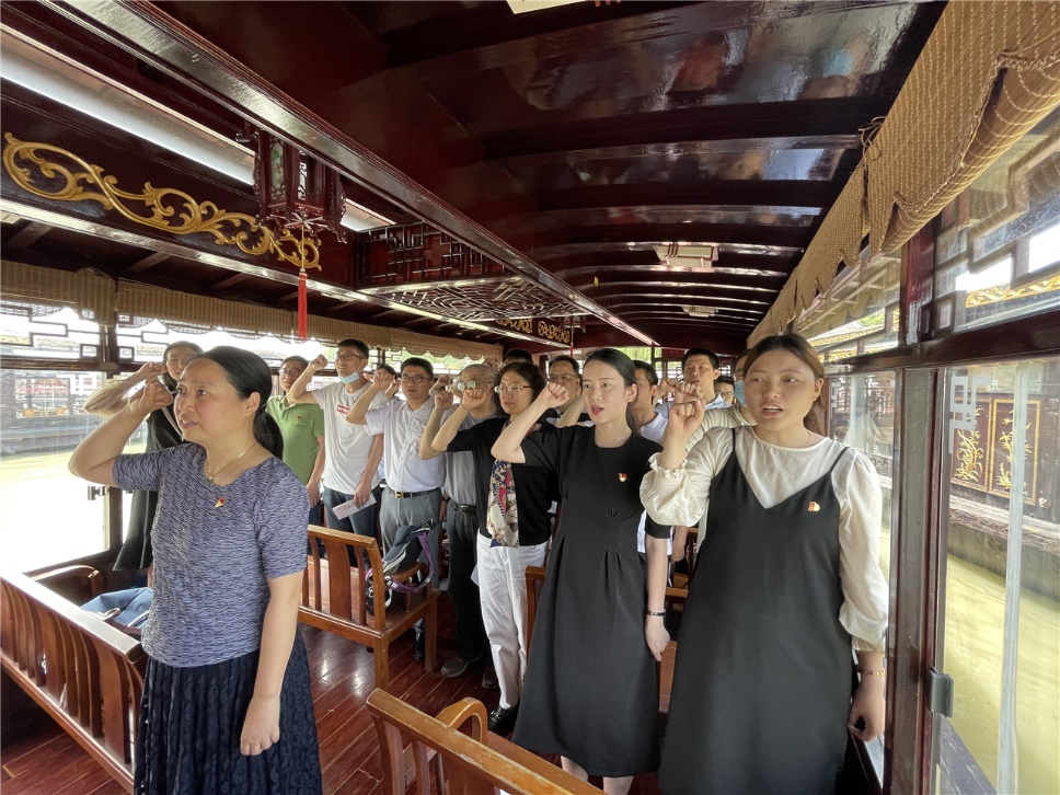 在革命“红船”启航地南湖,学院党总支书记宋伟文带领参加活动的全体党员同志,面向党旗,举起右手,重温庄严的入党誓词,让党员同志们再次接受心灵的洗礼,铭记庄严的承诺,牢记党员的政治责任、奋进初心和光荣使命。