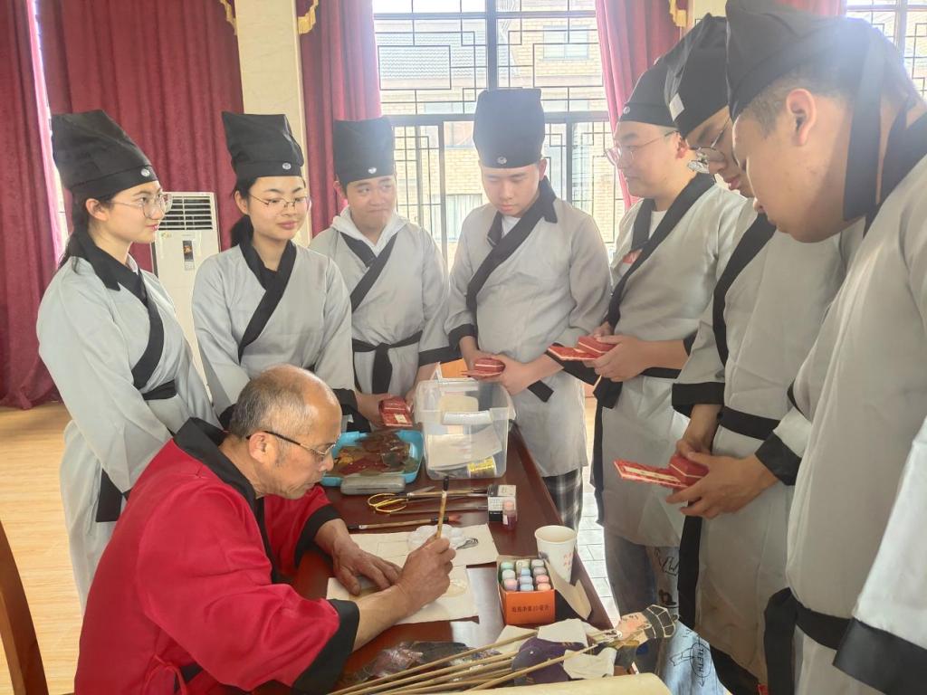 活动第一部分——拜师仪式。智能制造学院螺丝钉志愿服务队的同学们身着学徒衣,行拜师礼,拜沈忠跃老师傅为师。大家将拜师贴递给师傅签署,并向师傅奉茶,表达自己的敬意。沈师傅也为同学们准备了精美的徒弟信物,以激励同学们在皮影文化传承上有积极的信念和不懈的坚持。活动第二部分——启动仪式。沈师傅为螺丝钉志愿服务队的同学们专业地讲解皮影的描绘、上色、表演等传统技艺,同学们认真聆听、学习。授课结束后,同学们临摹了师傅准备的皮影人物,并在师傅的指导下尝试操作。