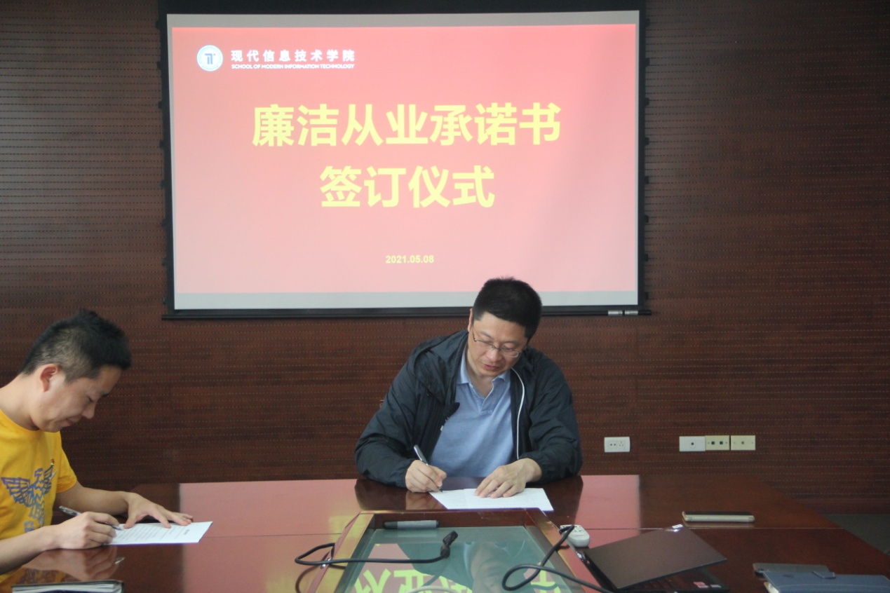 在迎接建党100周年之际,为进一步落实省委“清廉浙江”建设要求,压实党风廉政建设责任,推动全面从严治党向基层延伸,不断提高教职员工廉洁从业意识,深化廉政风险防控工作,根据学校《关于推进“清廉校园”建设的实施意见》精神,按照学校纪委统一部署,现代信息技术学院于5月8日下午举行“廉洁从业承诺书签订仪式”,全员签订《廉洁从业承诺书》。签订仪式由党总支书记任峰主持并讲话。