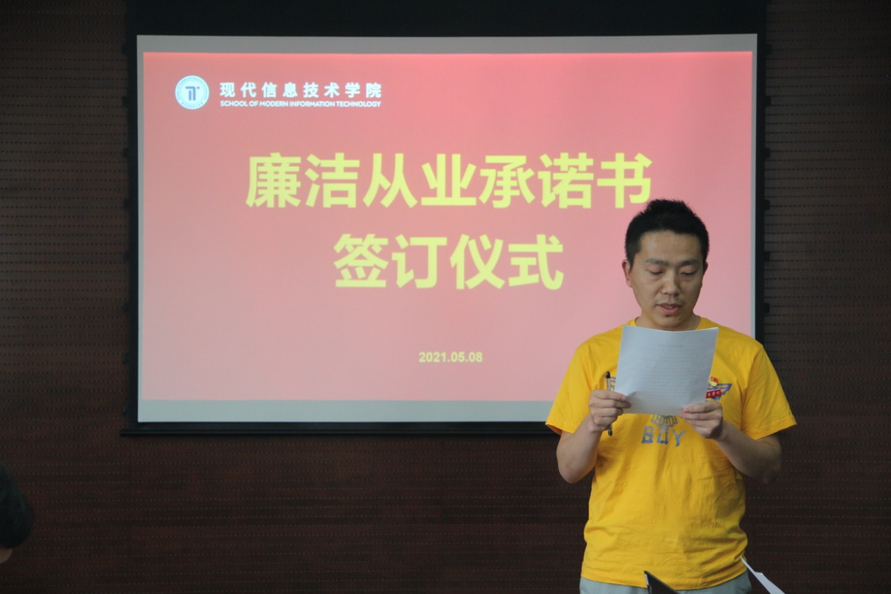 计算机应用技术专业教研室教师邹会来代表全体老师宣读了《廉洁从业承诺书》,承诺恪守教师职业道德,廉洁从业,接受组织和广大员工的监督,如违反承诺,自愿接受组织处理和纪律处分,承担违纪责任和法律后果。