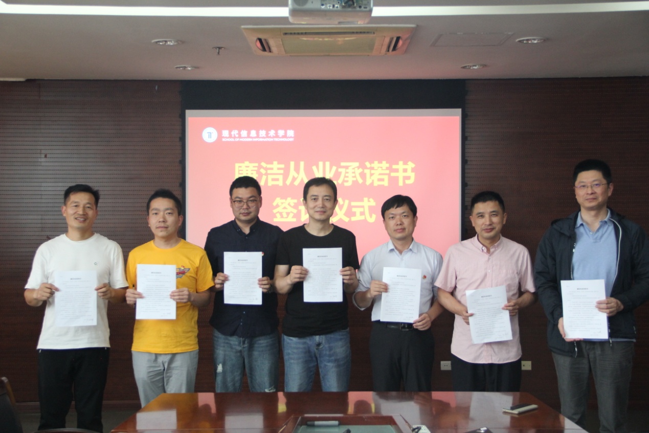 院长卢涤非、副院长江洪、党员教师欧志球等7位教师,分别代表学院中层、党员、专业负责人、专业教师、辅导员、行政和实验管理、信息管理中心等各方依次上台签订《廉洁从业承诺书》。