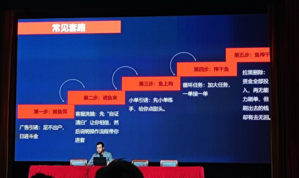 讲座中,潘部长从诈骗案件发案形势、电信网络诈骗的类型、发案最多的诈骗类型、电信网络诈骗流程、以及如何进行安全防范等方面展开。他指出,电信网络诈骗案件中被诈骗人员均具备以下类型:“想捡钱”、“想生钱”、“想挣钱”、“想省钱”、“想借钱”、“想要爱”、“想要性”、“想当然”等。电信网络诈骗发案最多的诈骗类型主要有:网络贷款诈骗、兼职刷单诈骗、投资理财诈骗、冒充身份诈骗和被骗金额最大的杀猪盘诈骗等五种类型。