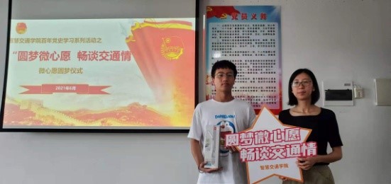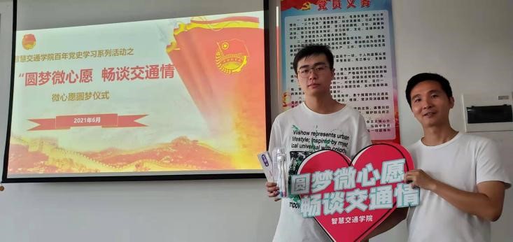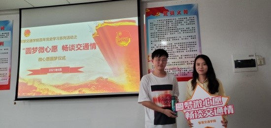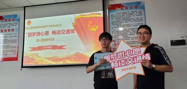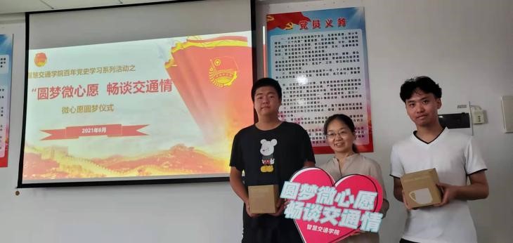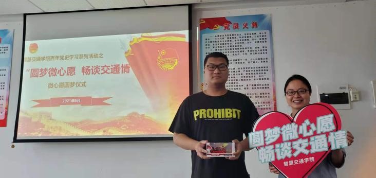 为喜迎建党100周年,深入学习贯彻落实习近平总书记在党史学习教育动员大会上的重要讲话精神,推动党史学习教育落实、落地、落细,教育引导广大师生从百年党史中汲取前进力量,以进一步发挥党员教师的模范带头作用,增强党员教师的奉献意识和服务意识,智慧交通学院党总支于本学期发起了“圆梦微心愿,畅谈交通情”的圆梦微心愿活动 并于6月9日下午在综合楼903会议室举行了微心愿圆梦仪式。校纪委书记王斌,分院党总支书记宋伟文、院长边浩毅、副院长王循明以及智慧交通学院各党支部党员教师代表、学生代表等参加了此次圆梦仪式。