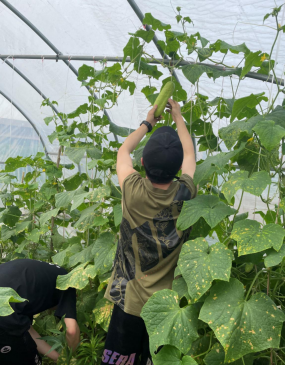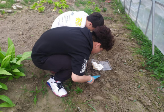 劳动成果转化,升华劳动实效。经过一下午的采摘和整理,同学们收获了新鲜健康的蔬菜,呵护了长势良好的西瓜。同学们将采摘的水芹菜、黄瓜、小葱等蔬菜赠送给金陵银色康乐养老院的老人们,与劳动经验丰富的老人们交流劳动过程和实践心得,同学们将辛勤劳动成果转化为爱心,以实际行动爱老敬老,体会深刻。