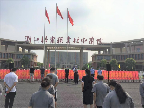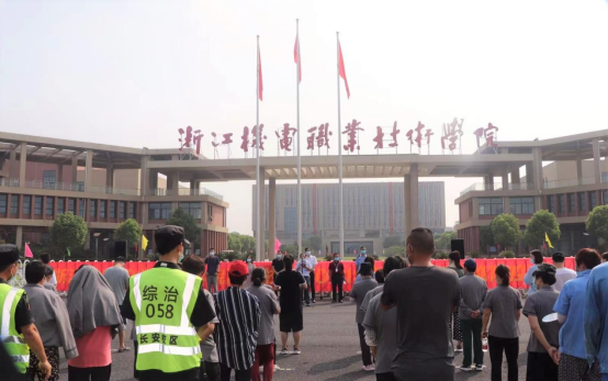 为进一步贯彻落实省教育厅、海宁市和学校秋季学期开学工作要求,强化疫情防控应急处置机制,提升现场应急处置能力,做好开学防疫准备,9月2日上午,我校海宁校区组织开展了疫情防控工作演示和应急处置演练。学校党委委员、副校长周纯江,省人民医院海宁市中心医院副院长胡海青、长安镇派出所驻校警长陈力莅临现场指导,学校各防控专项小组成员、辅导员、班主任、消毒保洁和安保人员共80余人参加本次演练。演练活动由海宁校区综合办主任陶勇主持。
