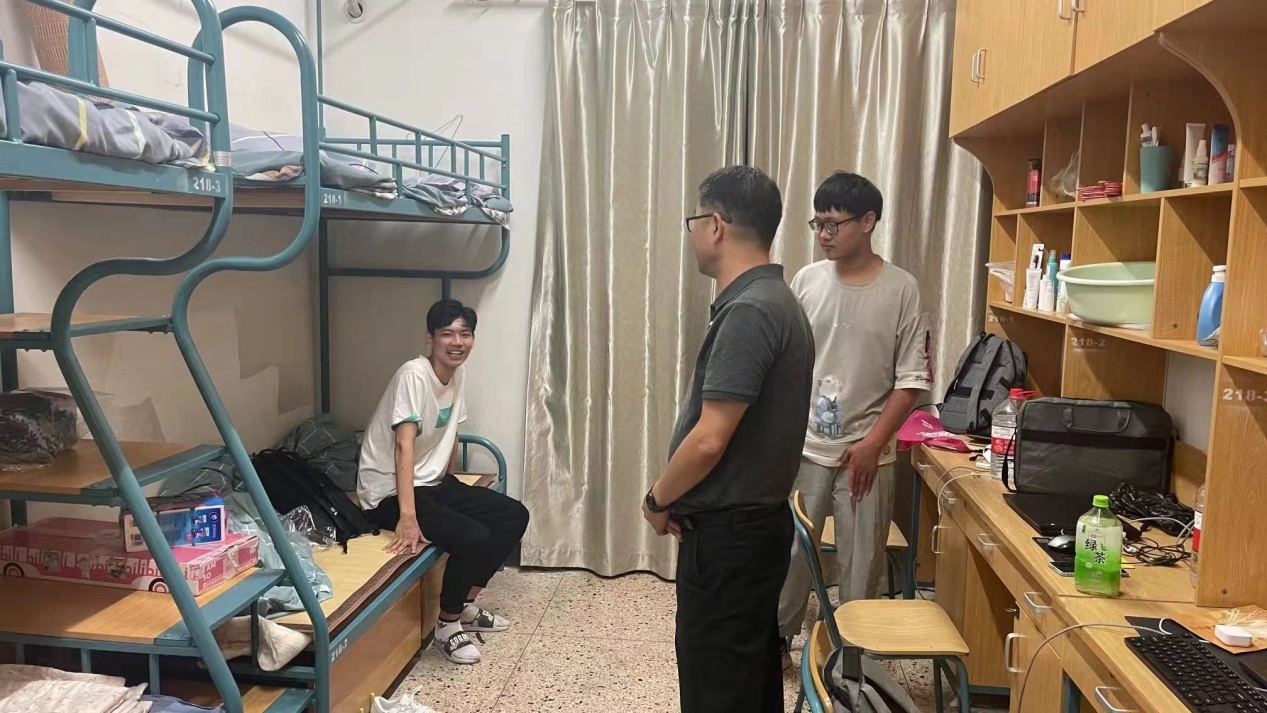 深入寝室看望新生。寝室内一片欢声笑语,任峰书记带领全体辅导员深入新生寝室看望新生,与同学们开展交流,了解到校方式和家庭情况;关注外省学生的学习及生活适应情况;结合学院特色活动,向同学们征询建议想法;对学生遇到的问题立即给出解决办法;对新生即将开展的大学宿舍生活提出希望与建议。