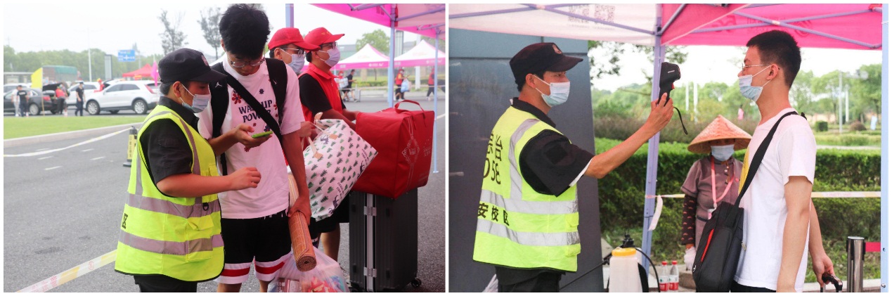 学校各大门设立了新生报到专用通道,在安保人员及志愿者的引导下,有序排队,出示“校园通行码”、行程卡、体温检测后进入校园,一站式完成报到手续。安保组严格管控校门,对校外私家车进行交通疏导,禁止外来人员及车辆入校,对所有教职工进入校园的车辆及人员进行测温、验码。医务组在各学校门口派一名医护人员开设医疗服务点,随时对发热新生进行应急情况处理。消毒组对校区公共场所进行消毒消杀,并及时对发热学生的活动轨迹进行消毒。