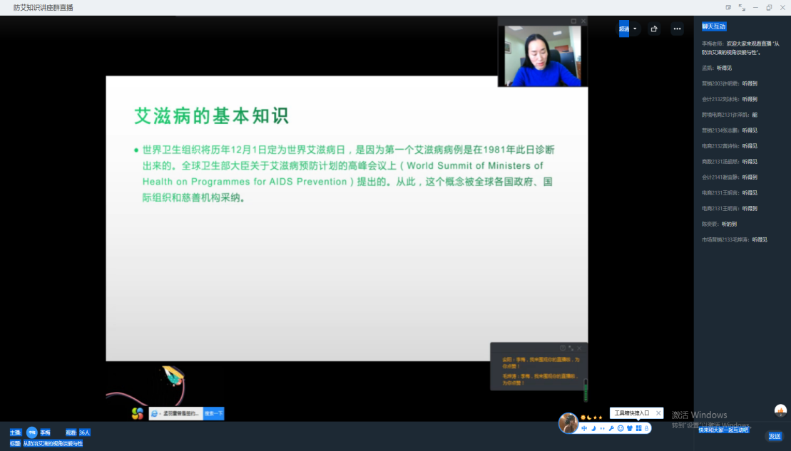 李梅老师首先深入浅出地向同学们讲解了艾滋病的基本知识、艾滋病的传播渠道以及对个人、家庭、国家、民族和社会的危害,在此基础上,她从爱情∙性∙婚姻角度阐述了爱情的内涵及爱情的意义,以及如何建立亲密关系,引导大家学习亲密关系中的沟通方法,帮助大家建立和维持良好的亲密关系,培养爱人与自爱的能力,实现在亲密关系中自我的成长。