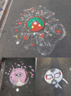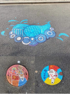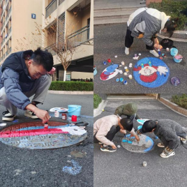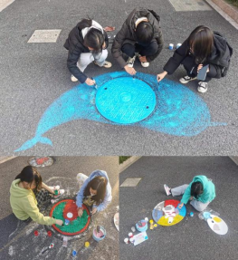 大家经过前期精心准备,选出了积极向上、形象生动的稿图对校区内多个井盖进行涂鸦创作。活动中,同学们用自己的妙笔巧手使校园中原本平淡无奇的井盖穿上了新装,一个个灵动的图案跃然而出:有的是一个遨游太空的宇航员,有的是一头巨大无比的鲸鱼、有的是一个金灿灿的太阳……同学们的奇思妙想不时引来路过的同学驻足观赏、发出阵阵赞叹。