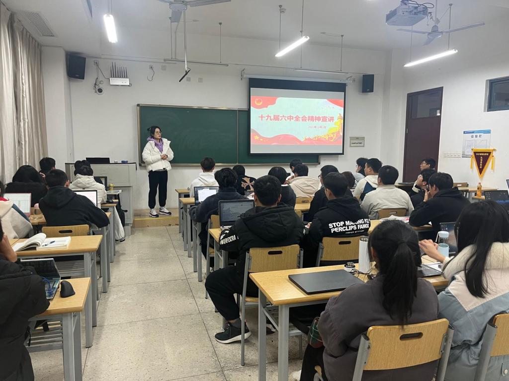 李晖老师面向2021级全体班级开展党的十九届六中全会精神宣讲。从“了解党的十九届六中全会的基本情况”“认识党的十九届六中全会的主要精神”“学习贯彻党的十九届六中全会精神”三个方面展开十九届六中全会精神解读。