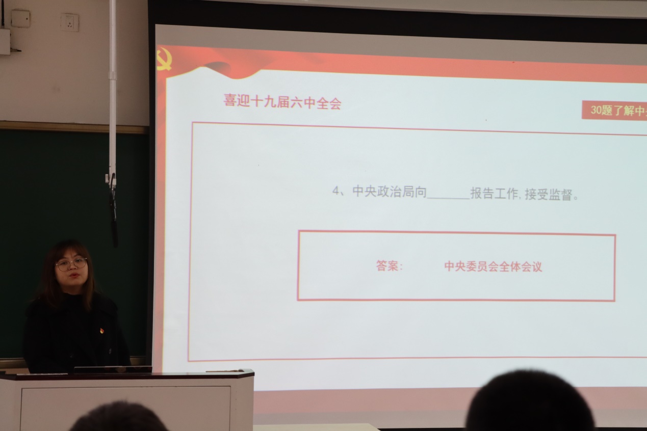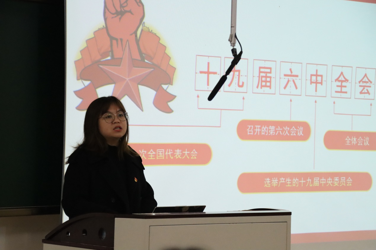 郝婉婷介绍了全会概况,对党的十九次全国代表大会以来的历次会议的主要内容进行概括,明确全会的历史意义。党的十九届六中全会审议通过了《中共中央关于党的百年奋斗重大成就和历史经验的决议》及《关于召开党的第二十次全国代表大会的决议》,郝婉婷从历史与现实相统一的维度宣讲党的百年奋斗重大成就和历史经验,与团学干部们互动探讨新民主主义革命时期到中国特色社会主义进入新时代各个时期党和国家的重大历史性成就和历史变革,并结合自身分享感悟,深入讲解了中国共产党百年奋斗的五大历史意义。