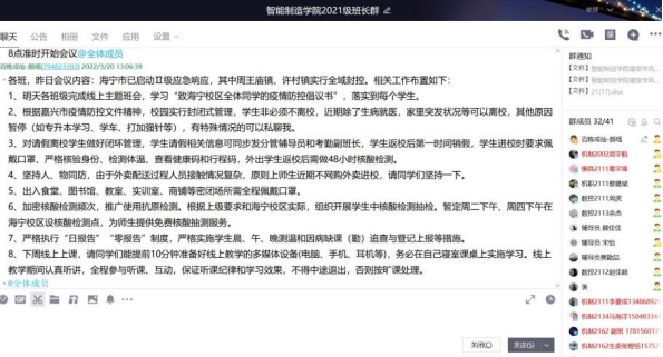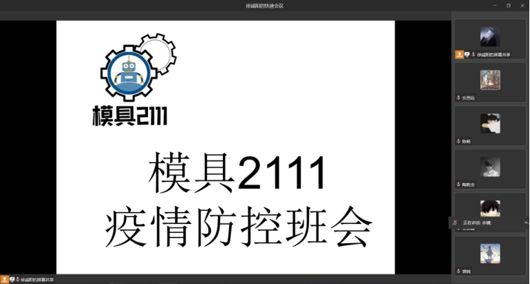鉴于海宁市当前疫情防控形势,按照学校部署和分院要求,智能制造学院海宁校区于3月20日开展线上“疫情防控”主题班会和2021级团学会议,落实学院海宁校区疫情防控工作。本次会议由各班班主任和分院海宁校区辅导员主持,2021级全体师生参与。