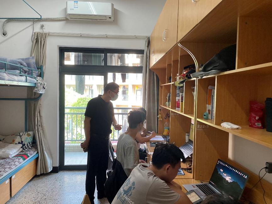 走访学生寝室,了解学生动态。任峰与同学们亲切交流,了解在校思想动态与生活、学习情况,引导同学们充分认识当前疫情防控形势的严峻性、复杂性,校园防疫工作的重要性、必要性,并提醒同学们主动了解防疫知识,自觉遵守防疫要求,加强自我防护。鼓励同学们增强户外体育锻炼,调节身心状态,提高身体素质,以积极向上的态度对待学习和生活。同时提醒同学们,多和同学、朋友、家人沟通交流,有困难及时找辅导员和老师沟通,学校是同学们的坚实后盾,与同学们共同渡难关。走访过程中,部分同学正在上网课,任书记叮嘱同学要按时参加线上学习,认真思考,积极交流,按时提交作业,保质保量完成所有学习任务。同时要加强自我管理,做到自律、自觉、自省,以积极的心态应对,做会学、善学、乐学的学习者。