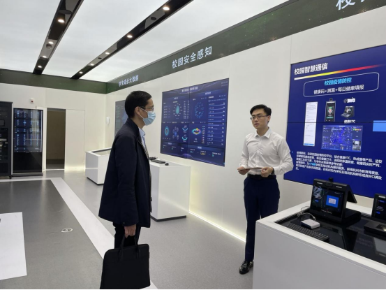周纯江副校长一行参观了“教育专场”“智能制造”“平安校园”“党建专场”等展示空间,亲身体验“智慧创新工厂”的,观看场景“数据驾驶仓”实例展示,重点了解了联通公司在智慧教育、平安校园、智慧校园等方面的实施情况。