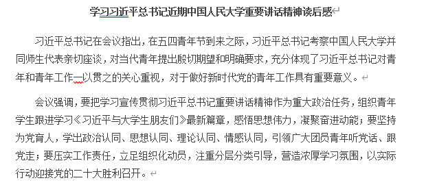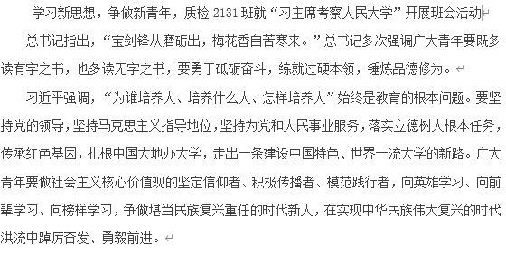 在五四青年节前夕,习近平总书记来到中国人民大学考察调研,向中国人民大学全体师生员工、向全国广大教育工作者和青年工作者致以诚挚的问候。习近平希望全国广大青年牢记党的教诲,立志民族复兴,不负韶华,不负时代,不负人民,在青春的赛道上奋力奔跑,争取跑出当代青年的最好成绩!5月1日,增材制造学院积极组织学生观看了习近平总书记考察调研中国人民大学时的重要讲话,深入学习讲话精神并开展了讨论。