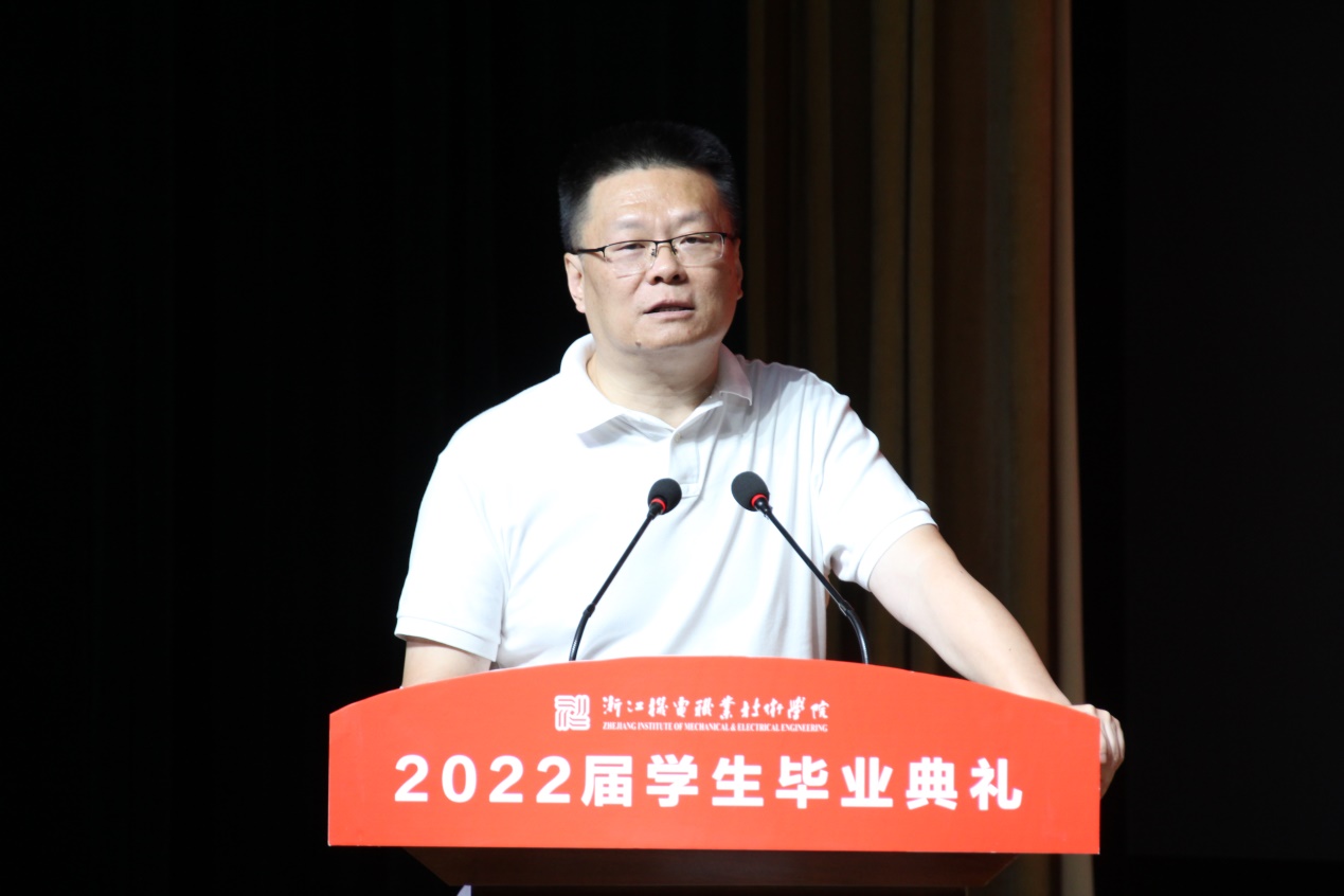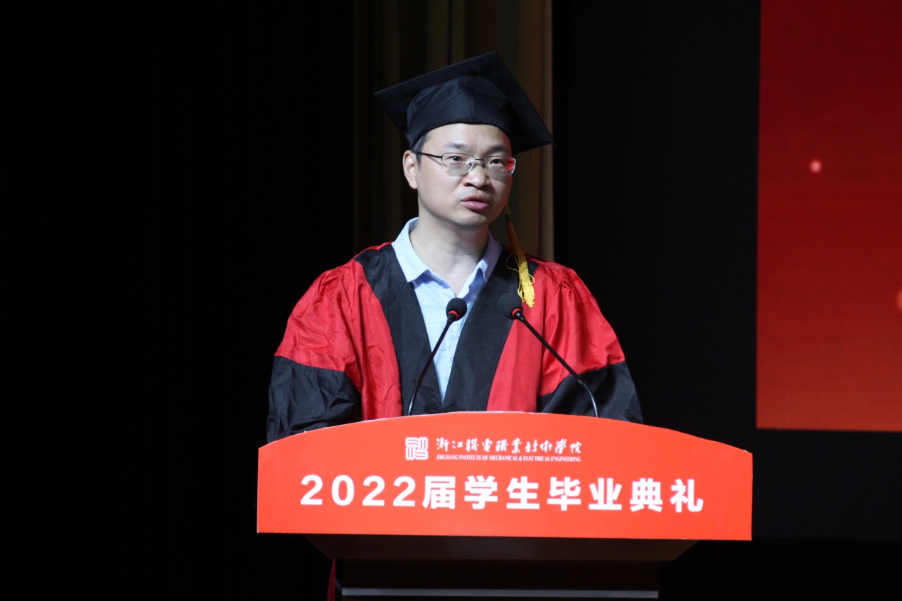 最后,浙江水利水电学院信息工程学院院长王军博士发表讲话。在见证浙江水利水电学院与浙江机电职业技术学院携手开展“双高”计划开花结果的重要日子里,他代表浙江水利水电学院信息工程学院祝贺获得学士学位的43名同学,希望毕业生今后不仅要以“求实、求精、求新”的校训为指引,也需牢记“自强、务实、尚德、求真”的八字箴言,诚挚祝愿即将各赴前程的毕业生前程似锦、不负韶华!