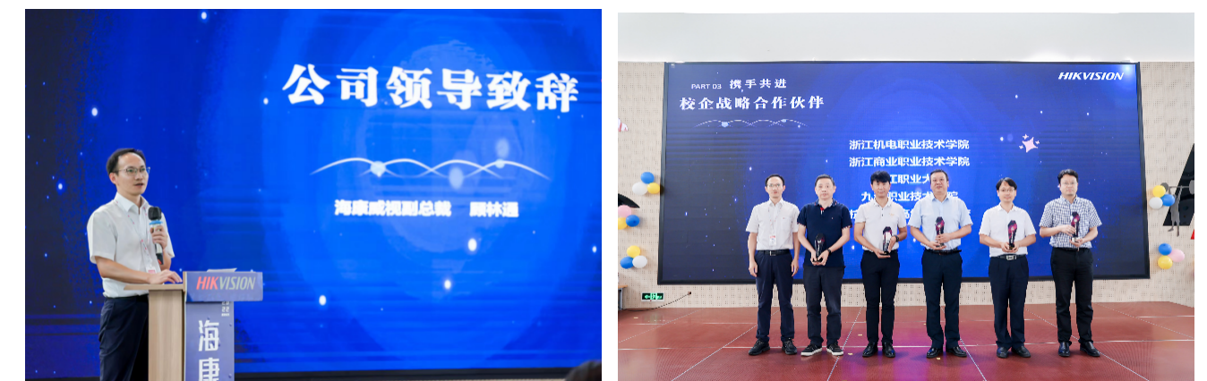 当天下午,走访教师一行受邀出席海康威视2022届应届生毕业典礼,海康威视副总裁顾林通致辞,顾总指出海康威视作为国内外安防领域的领军者积极践行与全国各大高职院校的校企双元育人战略,实现校、企、生三方携手共进。我校作为海康威视的校企战略合作伙伴,由刘哲纬处长上台接受表彰。