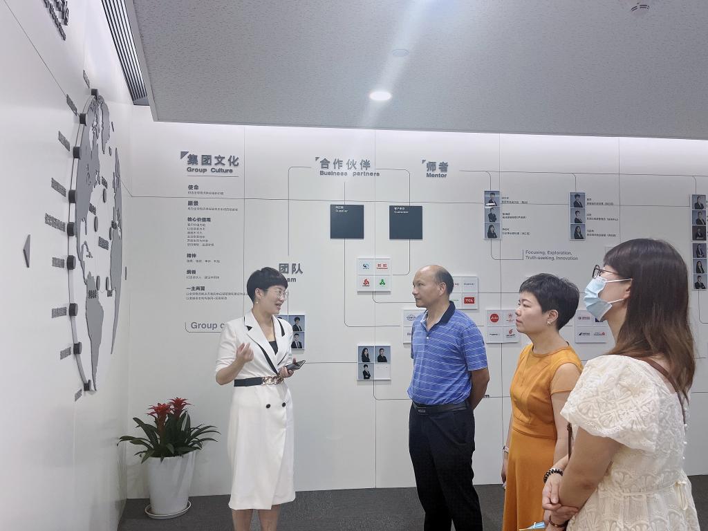 倪华芬总裁带领葛永明院长一行参观了企业文化展区和用不同颜色寓意的企业办公区,“一键订舱”平台给老师们留下了深刻的印象,深切感受到了数字经济时代数据之重要性、学校教育教学数字化转型之迫切性。