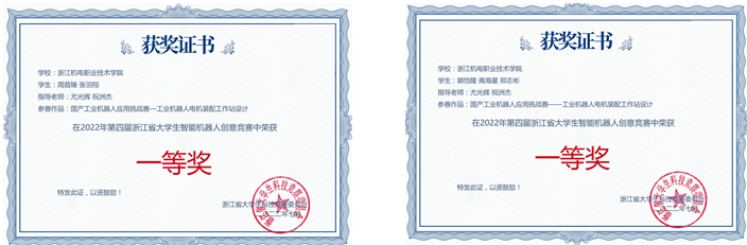 7月6日—7日,浙江省第四届大学生智能机器人创意竞赛在宁波工程学院举办,我校智能制造学院派出3支队伍参加“国产工业机器人应用挑战赛”,经过激烈角逐,全部获得二等奖及以上荣誉,包揽专科组的2项一等奖,尤光辉、祝洲杰2名教师获优秀指导教师称号。