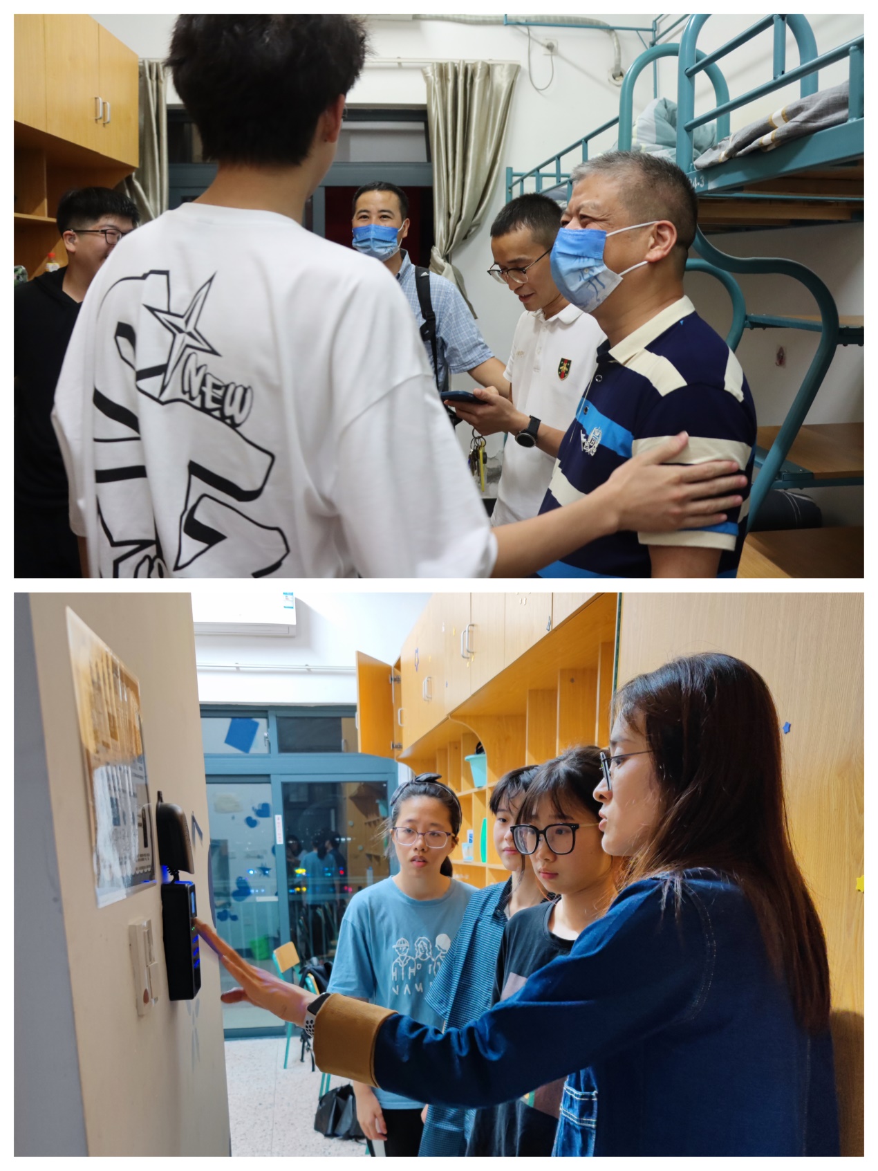 学生寝室内一片欢声笑语,学院领导与辅导员老师们深入寝室看望新生,与同学交流,了解到校方式与家庭情况;关注外省学生的学习与生活适应;对即将开启的大学新征程提出希望与建议;针对学生遇到的问题立即给出解决的办法。各班级班主任老师们进入宿舍看望学生,与同学们畅谈职业生涯规划并给出专业建议。