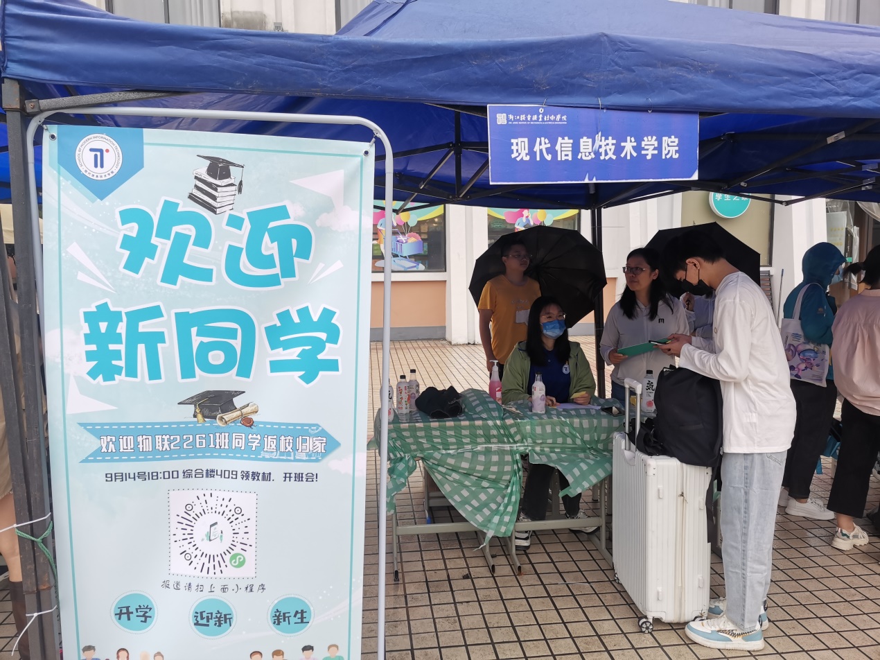 风雨中,滨江校区的迎新点已经准备完毕。现代信息技术学院物联2261班班主任吴旭华老师与辅导员老师们早早到位,迎接即将到来的22级本科班同学。