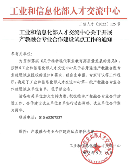 2022年9月13日,工业和信息化部发布工信人才【2022】125号文,我校汽车智能技术专业入选工业和信息化部第一批产教融合专业合作建设试点单位。