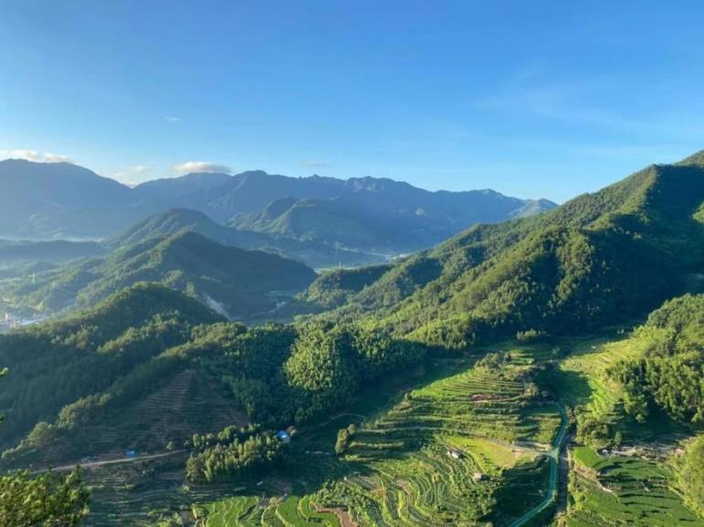 这是我的家乡浙江丽水庆元,庆元是中国廊桥第一乡、中国生态环境第一县、中国香菇第一城。我跟着党的号召“绿水青山就是金山银山”,也给庆元打出一个口号:“这里的山最青,这里的水最绿,这里是空气有点甜。”以此表达出我对祖国大好河山的热爱。
