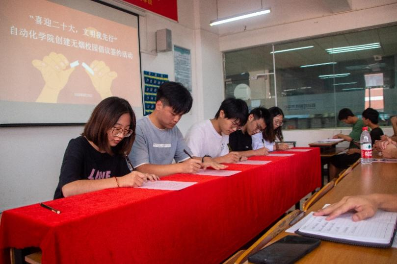 为推进和谐校园建设,提倡社会公德意识,为广大师生营造一个健康的学习环境和无烟的绿色校园,共同迎接党的二十大的胜利召开,9月20日,自动化学院于13-416举行创建无烟校园倡议签约活动,倡议:“创建无烟校园,树立文明新风;拒绝吸食香烟,让肺自由呼吸;打造清新空间,共享无烟生活”。自动化学院党总支副书记罗鹏举、全体辅导员、学生干部和班长参加了本次活动。