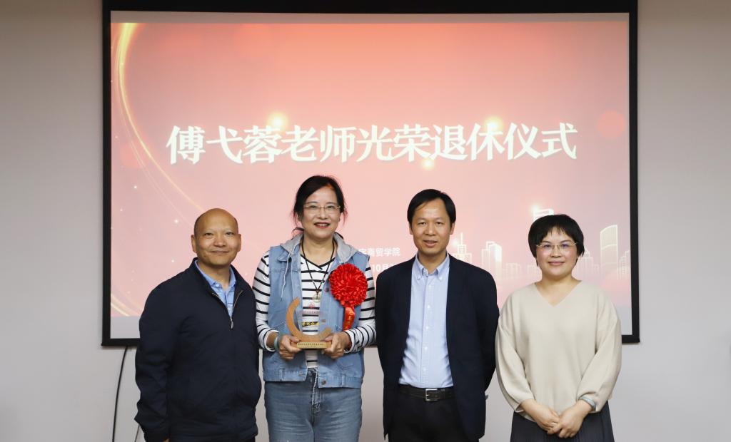 随后举行了傅弋蓉老师光荣退休仪式。程勤华书记发表了热情洋溢的讲话,充分肯定了傅弋蓉老师为学校教育事业作出的贡献,并希望傅老师退休不退志、离岗不离心,在合理安排好自己退休生活的同时,能够常回来看看,一如既往地关心、关注和支持学院建设发展。毕业生代表程超杰通短视频深情回忆了在校期间傅弋蓉老师对他的关心和教育,也为傅老师送上了良好的退休祝福。最后全体老师齐唱《生日歌》,祝愿傅老师生日快乐,退休快乐