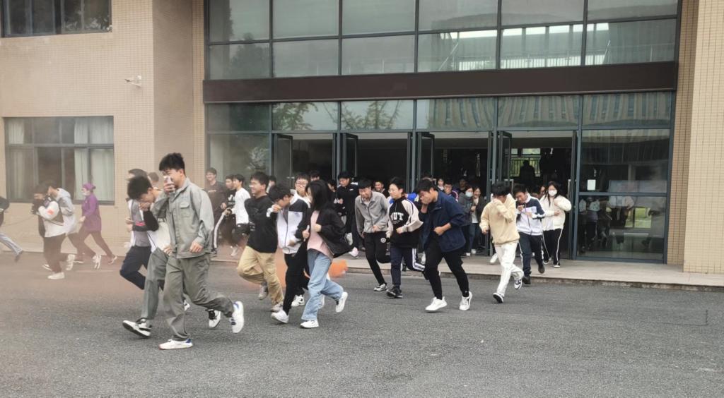 海宁校区消防演练现场,教学楼烟气浓密,警报声响彻校区,师生们在学校安保人员的疏散引导下,弓身沿着疏散指示通道跑出,在最快的时间内有序地从教室撤离到安全地带。医疗救援、消防人员、校安保人员快速反应,个个训练有素,组织灭火救援和疏散演练工作顺利完成。