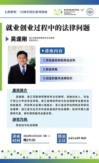 为加强我院就业创业指导工作,在广大毕业生中普及就业创业劳动法常识,拓宽学生就业创业视角,进一步促进我院学生就业创业能力提升,近期,智慧交通学院开展“就业创业中的法律常识”主题讲座。讲座由浙江司乾律师事务所主任律师、创始合伙人吴逢刚主讲,智慧交通学院党总支书记黄柯信、就业辅导员石涛及100余名学生参加了本次讲座。