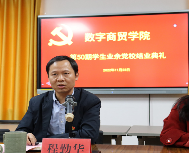 2022年11月23日下午,数字商贸学院在2-312举行了第50期学生业余党校的结业典礼。出席本次典礼的有数字商贸学院党总支书记程勤华,党总支副书记李君,市场营销专业党支部书记潘江南,会计专业党支部书记周晓东及所有学员。
