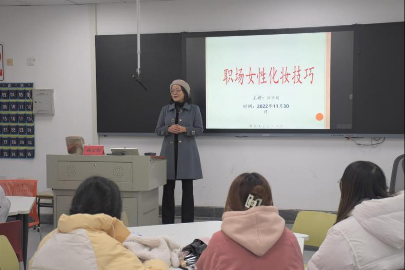 为贯彻落实党的二十大精神,丰富学生的课余生活,展示我院学生良好的精神面貌,11月30日下午开展了关于职场女性化妆技巧的讲座,此次讲座邀请我校职业礼仪工作坊负责人,教育部职业核心能力培训礼仪讲师孙京娟老师为同学们主讲。