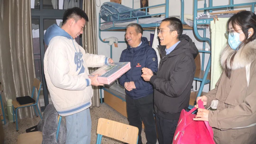 12月1日晚,大雪纷飞。学院党总支书记张荣路带队滨江校区辅导员们走进同学们的寝室,亲手将代表学院党总支关怀的新棉被与床上用品送到13名同学的手中。在同学们惊喜而感动的目光中,张书记告诉大家:“学院党总支时刻关注、关心、关爱着同学们,希望大家快乐学习,奋发有为。”他暖心提醒同学们,在寒冬之时更应保持健康的生活习惯与作息,以强健的体魄、心态学习生活。同学们表达了对张书记及党总支的感谢,表示今后会更加努力学习、积极生活,不辜负老师们的真心爱护与关怀。