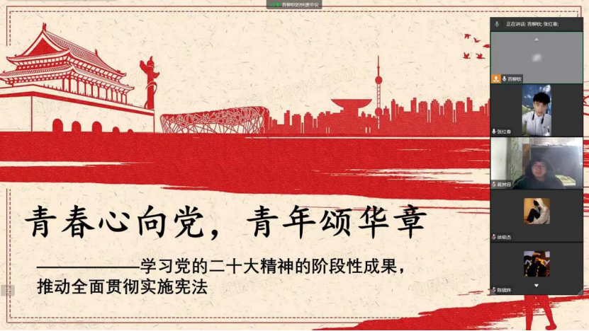 同时各班团支书在宪法日之际以线上会议或线下班会的形式展示宣扬宪法的PPT,播放与我国宪法有关的短视频以及学习习近平总书记在党的二十大上所作的发言,将宪法精神和党的二十大精神深植同学心中,引领班级同学们更深入感悟宪法和党的二十大精神内涵,从中寻找红色基因,传承红色血脉,回望过去、了解当下、展望未来。