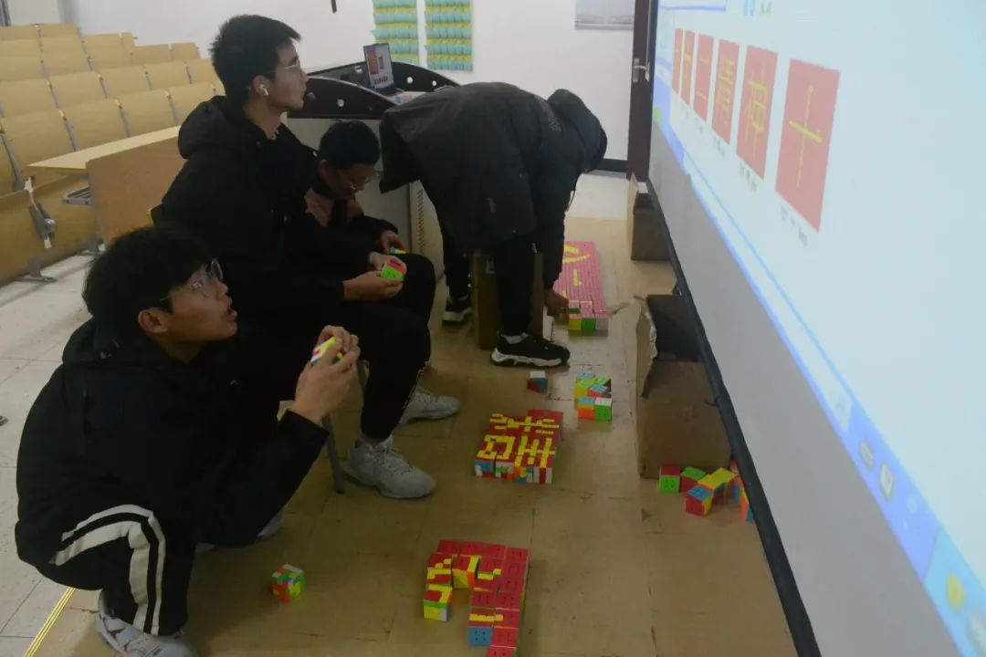 在魔方社,350个魔方到位,图纸打在投影上,剩下的就是把魔方一个个对照图纸拧出对应的图案。面对巨大的工程,同学们一边对着图纸加以分析,一边将巨大的图纸分成一个个小块,协作完成。看着一个个魔方在自己的手中一点一点的累积成墙,同学们既感到喜悦,又越来越期待完工后的样子。“自强自信 守正创新 踔厉奋发 勇毅前行”,同学们用自己的行动践行着二十大精神,将自己的决心筑成这魔方之墙,展示给机电师生。