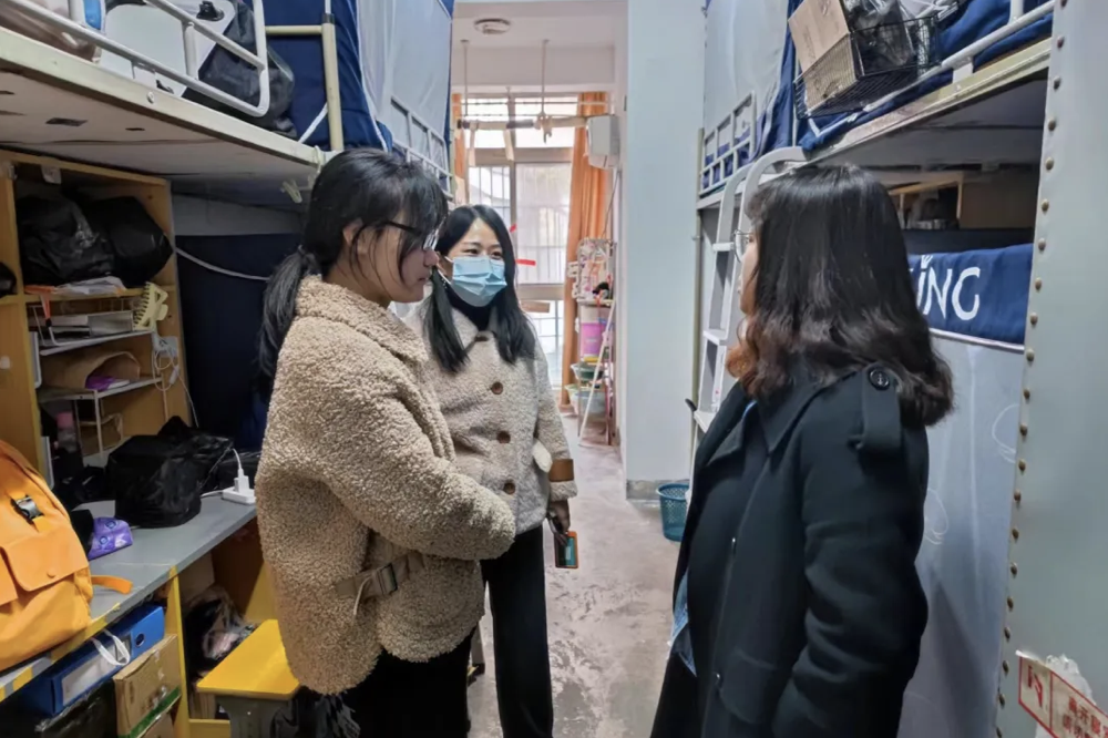学生到校后,学院党总支书记张荣路,副书记朱爱民带队学工线辅导员、班主任,第一时间深入学生寝室看望到校学生。张荣路书记详细了解学生返校情况,就工作开展力度进行检查与指导。同学们见到亲切的领导老师们,开怀畅谈,张书记叮嘱同学们尽快调整好作息和生活状态,重视寝室卫生和用电安全,严防电信诈骗,守好“压岁钱”,以积极向上的面貌来迎接新学期。
