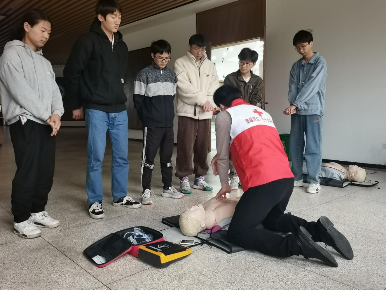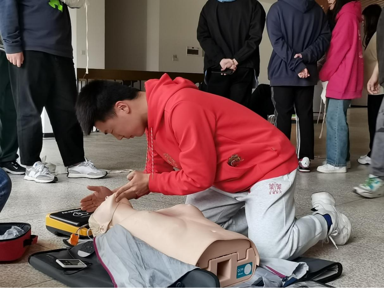 安全无小事,智慧交通学院高度重视安全工作,开学初就将2023年急救培训提到工作日程,通过班主任会议、学生干部会议、寝室安全网格员培训等将急救培训的重要性进行了宣贯,并引导广大师生提前开展应急救护、意外伤害、突发事件、心肺复苏以及AED使用等急救培训线上理论视频学习。开班培训现场,董老师通过理论讲解和实践操作相结合的模式进行生动培训。她详细讲解了红十字运动基本知识、救护概论、心肺复苏和创伤救护等内容,然后就心肺复苏、绷带和三角巾的包扎方式、自动体外除颤仪(AED)使用等进行示范演练。“手臂伸直,十指相扣,以髋关节为支点,按压和吹气比例为30:2”、“根据AED电极片上的图示,将一片电极片贴在患者裸露胸部的右上方(胸骨右缘,锁骨之下),另一片电极片贴在患者左乳头外侧”,师生轮流模拟操作过程中,培训讲师们耐心细致指导,直到所有参训人员熟练掌握技巧。