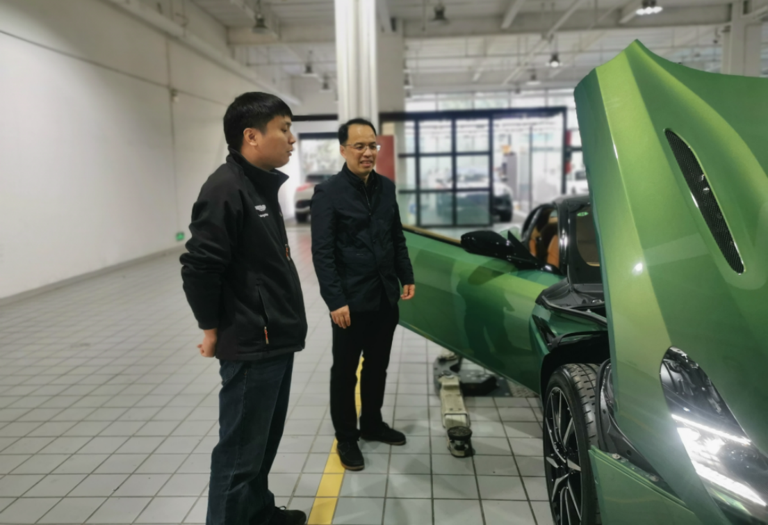 杭州阿斯顿马丁汽车销售有限公司技术总监丁水兵热情接待了智慧交通学院一行领导,丁总监同时也是我院汽车电子技术专业2005级优秀毕业生。此次走访活动中,丁总监带领大家走进展厅、车间进行实地考察,介绍了企业当前的经营情况及各个岗位的具体工作内容。他表示,自己的成长离不开母校和老师们的培养,他常怀感恩之心,期待能跟母校有更紧密的联系,也欢迎学院输送更多优秀学子到公司实习、就业。