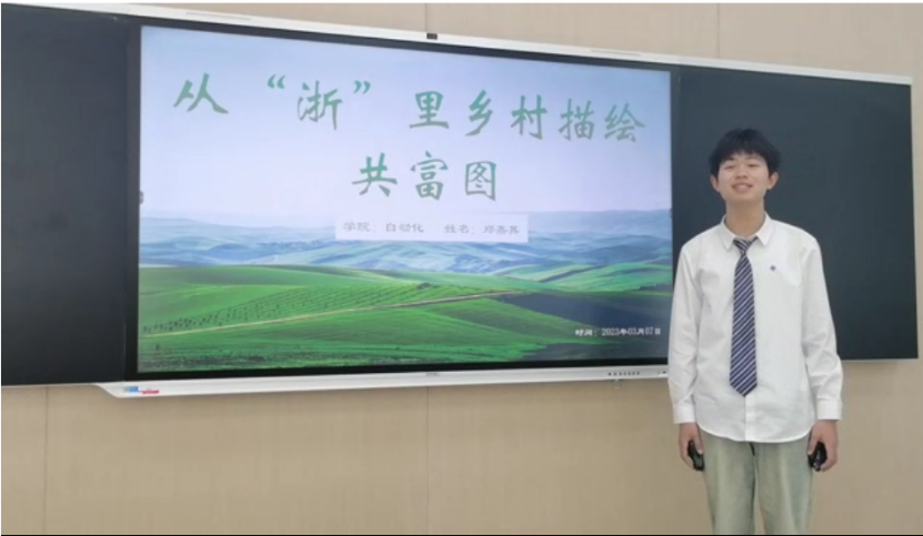 本次选拔赛获得了师生的大力支持,电气2103班江毅同学以“在责任与担当中贡献青年力量”为主题,从为贫困山区奉献一生张富清引入,讲述了自己的军旅生涯及退役复学后的责任与是使命,愿以强国为梦,牢记党和人民的殷切盼望,不负时代,不负韶华。电子2211班郑嘉其以“从“浙”里乡村描绘共富图”为主题生动讲述了家乡下姜村的致富路,从小小下姜村反映出浙江将以习近平总书记关于“三农”工作重要论述为指引,大力弘扬红船精神和浙江精神,坚定不移沿着“八八战略”的路子走下去,高质量推进农业农村新发展,用一个个美丽乡村迭代升维绘就共同富裕新图景。