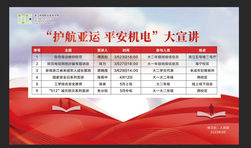 开学以来,学校轰轰烈烈开展了以“护航亚运 平安机电”为主题的大宣传、大检查、大创建活动,随着活动不断推进,三月平安办启动了大宣讲活动,3月23日以“在你身边,教你防范”为主题的防诈宣讲拉开了大宣讲的帷幕。